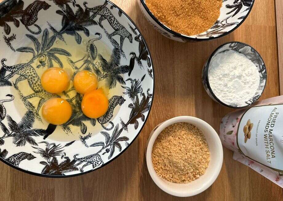 - Combine Dry Ingredients: Add the ground Marcona almonds, corn flour, melted chocolate, and a pinch of salt to the egg mixture. Mix thoroughly until you have a smooth, homogeneous batter.
