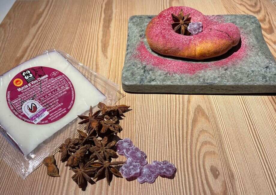 For this special version of the Ensaimada Mallorquina, you will need Murcia al vino cheese, sweet potato cream, the standard dough ingredients, and wine powder.