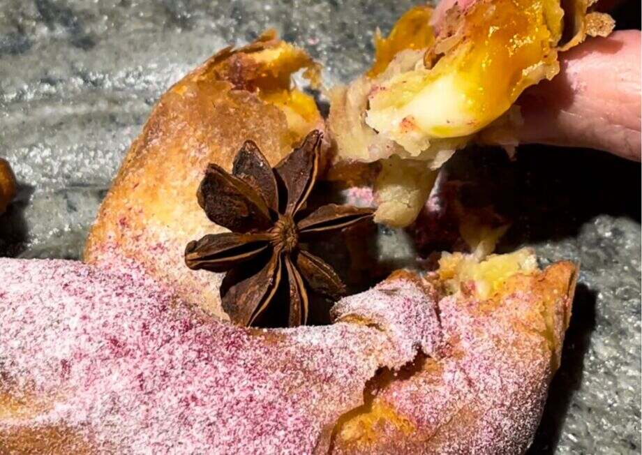 Before serving, sprinkle the ensaimada with powdered sugar and wine powder, adding a unique flavor and texture contrast. For the final decoration, we add star anise to provide a aniseed-like aroma. We also include a violet candy, which adds an aesthetic touch and pairs excellently with the flavors of sweet potato, cheese, ensaimada, and anise.