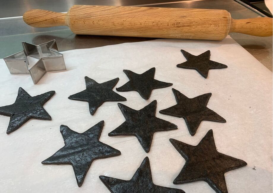 - Take out the dough and roll it out with a rolling pin on baking paper until it is thin, and cut shapes with a cookie cutter.