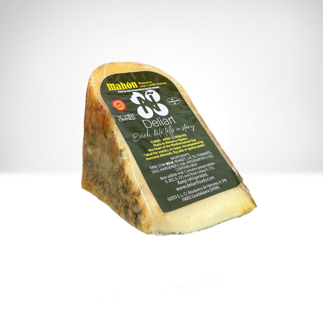 Experience the rich depths of Deliart Mahon Cured, the distinguished elder of the Mahon cheese family from the serene island of Menorca. Aged meticulously for five months to over a year, this mature cheese evolves into a firm, crumbly delight that boasts intensified flavors and a robust texture. Each piece carries the legacy of Menorcan tradition, with a rind that darkens over time, an orange hue kissed by paprika, reflecting its artisanal heritage.